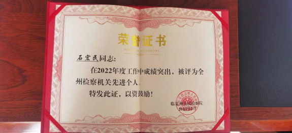 2023年2月2日,康乐县院在临夏州人民检察院组织的2022年度工作考评中,获得“全州检察机关先进集体”荣誉称号,副检察长石宏民获得“全州检察机关先进个人”表彰。